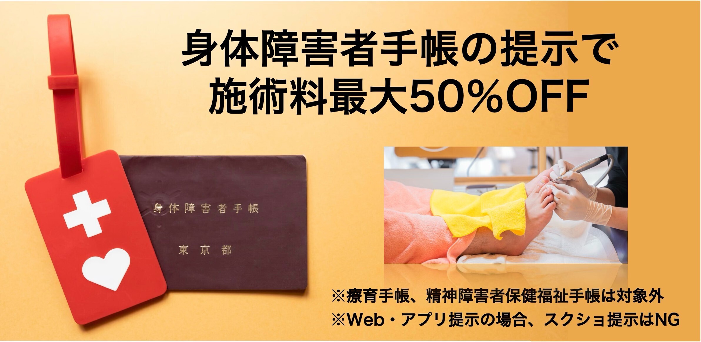 身体障害者手帳をお持ちの方はご提示ください❗️程度にもよりますが最大で50%OFFとさせていただきます🦶